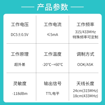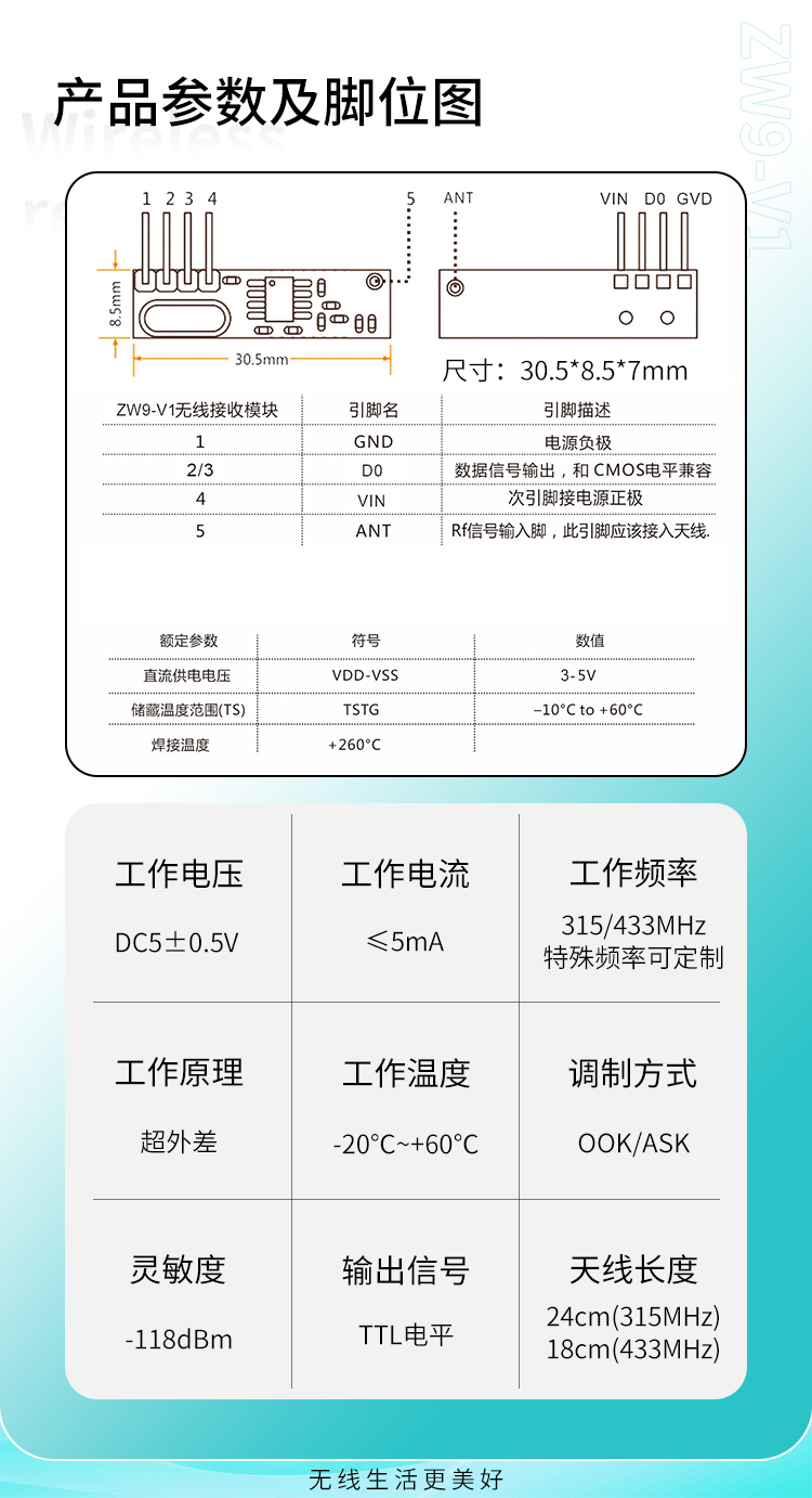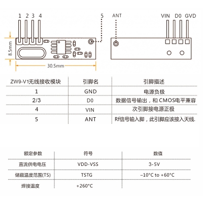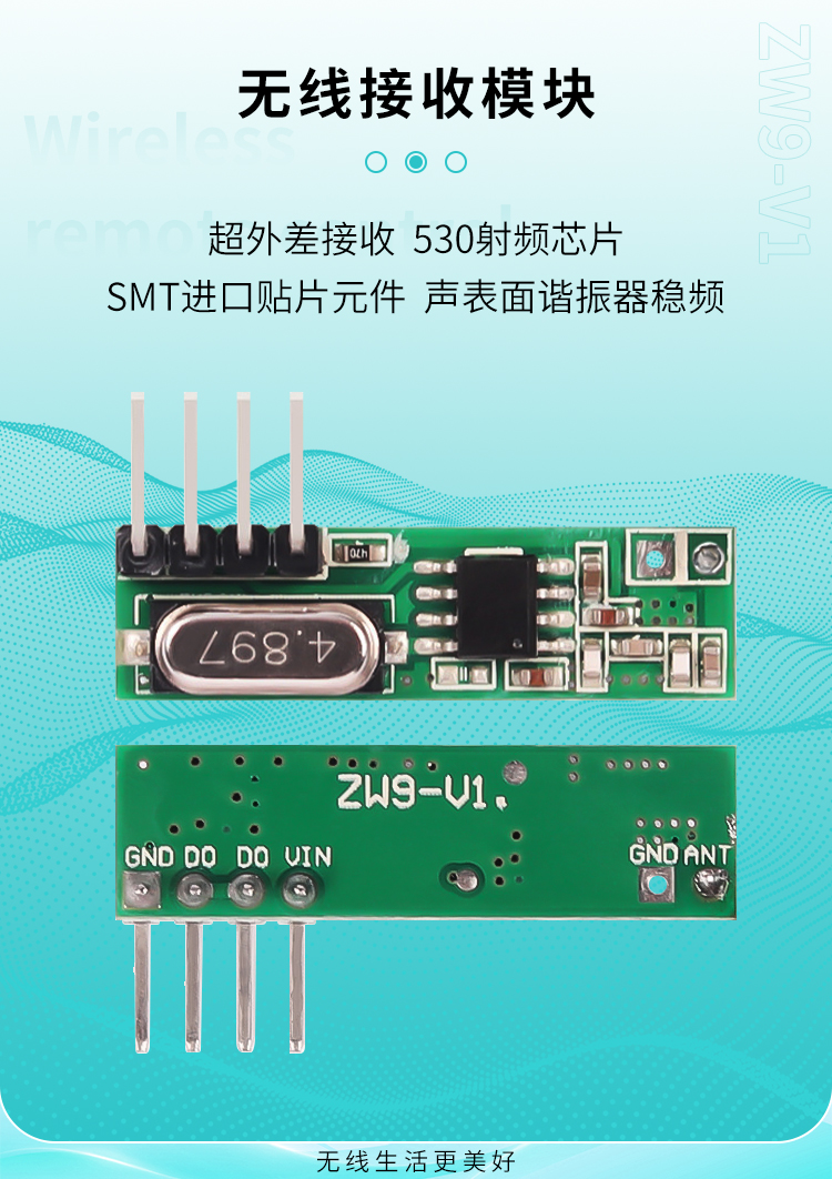 ZW9-V1接收模块采用最新研制的超高频,超外差、低噪声芯片,具有高抗干扰能力