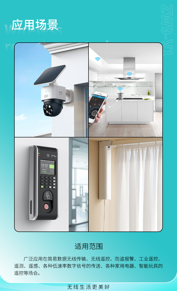 特别适应具有直流电机火花干扰的环境下使用,受到国内外车库门遥控器系统、工业遥控器、遥感、遥测、安防报警器、伸缩门、道闸、GSM/GPS车载系统等行业的青睐。